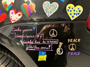 „Ruhm für die Ukraine, Ruhm für die Helden, Ruhm für alle Ukrainer. Wir lieben euch“. Mit einem Lackstift hat eine Fünftklässlerin aus Russland die Worte in kyrillisch auf einen Porsche SUV geschrieben. Kein Akt der Sachbeschädigung, sondern ein Herzenswunsch des Mädchens, eine Botschaft mitzusenden. Der Geländewagen ging jetzt in einem Konvoi in die Ukraine, um dort zu verbleiben. 24. Februar – ein trauriger Tag. Deshalb 365 Herzen, individuell gestaltet, die den Porsche zieren.