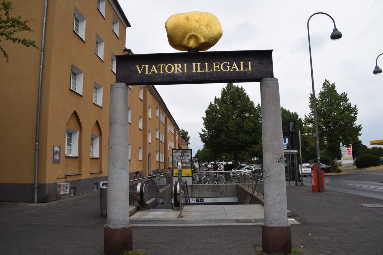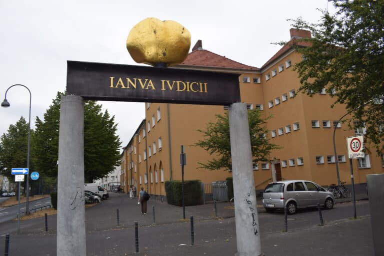 So ähnlich geht es vielleicht Personen an der U-Bahn-Haltestelle „Akazienweg“, deren Eingang auf der Venloer Straße ein Torbogen mit einem großen, goldfarbenen Stein, gestaltet von Künstler Heinz Brummack, bildet. Zwei lateinische Texte befinden sich auf dem Bogen – zum einen „IANVA IVDICII“ (Tor der Gesetzmäßigkeit) und zum anderen „VIATORI ILLEGALI“ (dem unrechtmäßig Reisenden). Kunstfreunde und Bürger mutmaßen, dass der Stein den Fahrgast vor der Tat des Schwarzfahrens abhalten soll – sozusagen als Symbol einer drohenden Bestrafung.