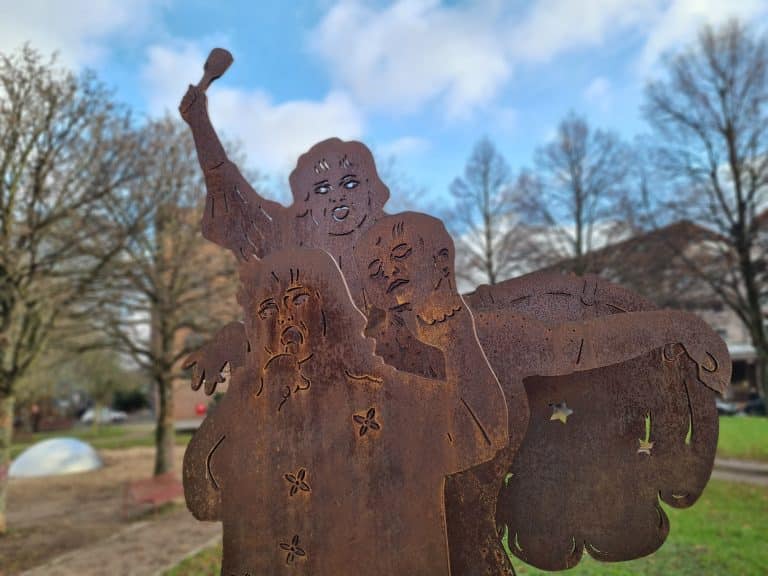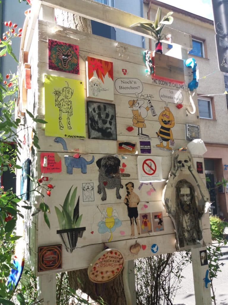 Zusätzlich hat Walter Kremp, ehemals Schulleiter der katholischen Grundschule Erlenweg, an einem Haus unmittelbar neben dem Tor mit einer Schulklasse in einer Aktion eine Tafel angebracht, die den Sinn des Kunstobjekts auch nochmal erklärt.