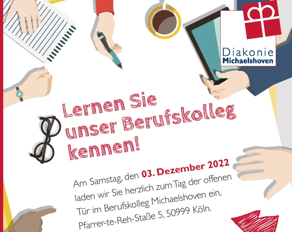 Am Samstag, den 03.12.2022 findet von 10 bis 13 Uhr am Berufskolleg Michaelshoven, Pfarrer-te-Reh-Str. 5 in Köln-Rodenkirchen, ein Tag der offenen Tür statt. Wer sich für eine Ausbildung im sozialen Bereich interessiert, hat die Gelegenheit sich einen Überblick zu beschaffen. Lehrer:innen und Schüler:innen stehen für Fragen zur Verfügung. Es gibt verschiedene Aktionsstände und es werden Führungen durch die Schulräume angeboten. Eine Anmeldung ist nicht erforderlich. Mehr Informationen zu den Ausbildungsgängen gibt es auf www.diakonie-michaelshoven.de