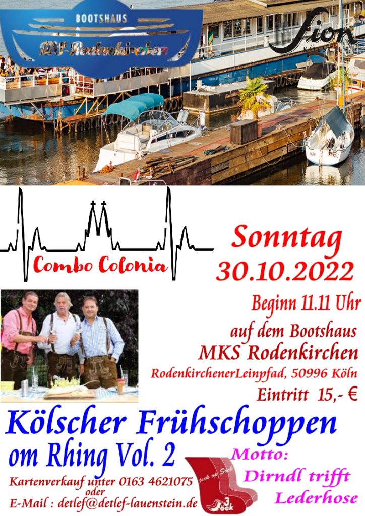 Es geht wieder los! Am Sonntag, den 30. Oktober, findet der „Kölsche Frühschoppen om Rhing“ wieder statt. Am MS-Bootshaus am Rodenkirchener Leinpfad erwartet die Besucher ein abwechslungsreiches Programm, das unter dem Motto „Dirndl trifft Lederhose“ stattfindet. Beim musikalischen Frühschoppen gibt es Live-Musik von den „3 Söck“ sowie eine Kostüm-Prämierung.