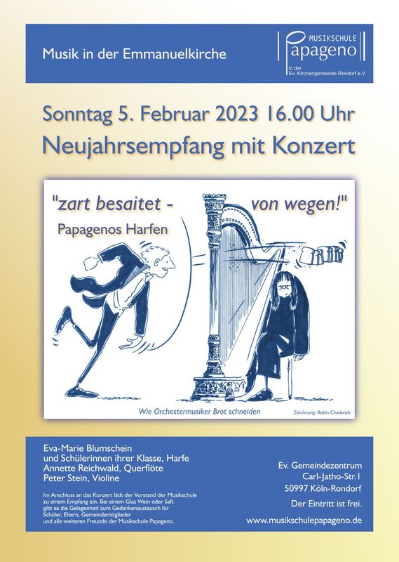 Neujahrsempfang der Musikschule Papageno in der Emmanuelkirche in Rondorf. Es musizieren Schülerinnen der Harfenklasse mit ihrer Lehrerin Eva-Marie Blumschein-Cepl. Bei einem Glas Wein oder Saft gibt es die Gelegenheit zum Gedankenaustausch für Schüler, Eltern, Gemeindeglieder und alle weiteren Freunde der Musikschule Papageno. Der Eintritt ist frei.