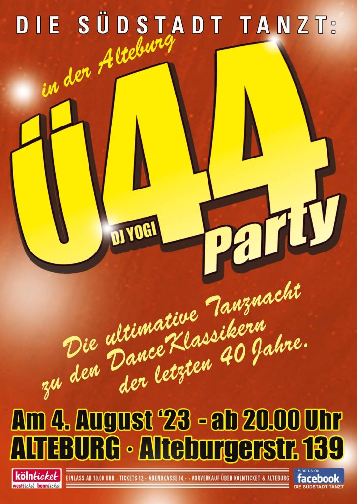 Am 4. August startet die nächste Ü44-Party in der großen Halle der „Alteburg“. DJ Yogi wird ab 20 Uhr allen Besuchern einheizen und die besten Tanz-Hits der leztten 40 Jahre präsentieren. Kommt vorbei und erobert die Tanzfläche zu den Klängen eurer Jugend.