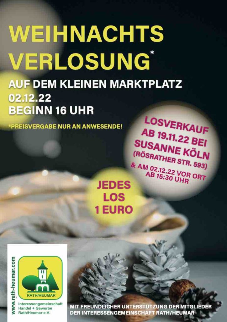 Am 02.12.22 findet endlich wieder die alljährliche WEIHNACHTSVERLOSUNG der IG Rath/Heumar statt!!! Wo: auf dem kleinen Marktplatz vor DM und Perino in Rath. Der Losverkauf startet am 19.11. bei @susanne_koeln_rath!! Also fleißig Lose kaufen und auf den Hauptgewinn hoffen! 🎉 wir drücken die Daumen und freuen uns auf euch!