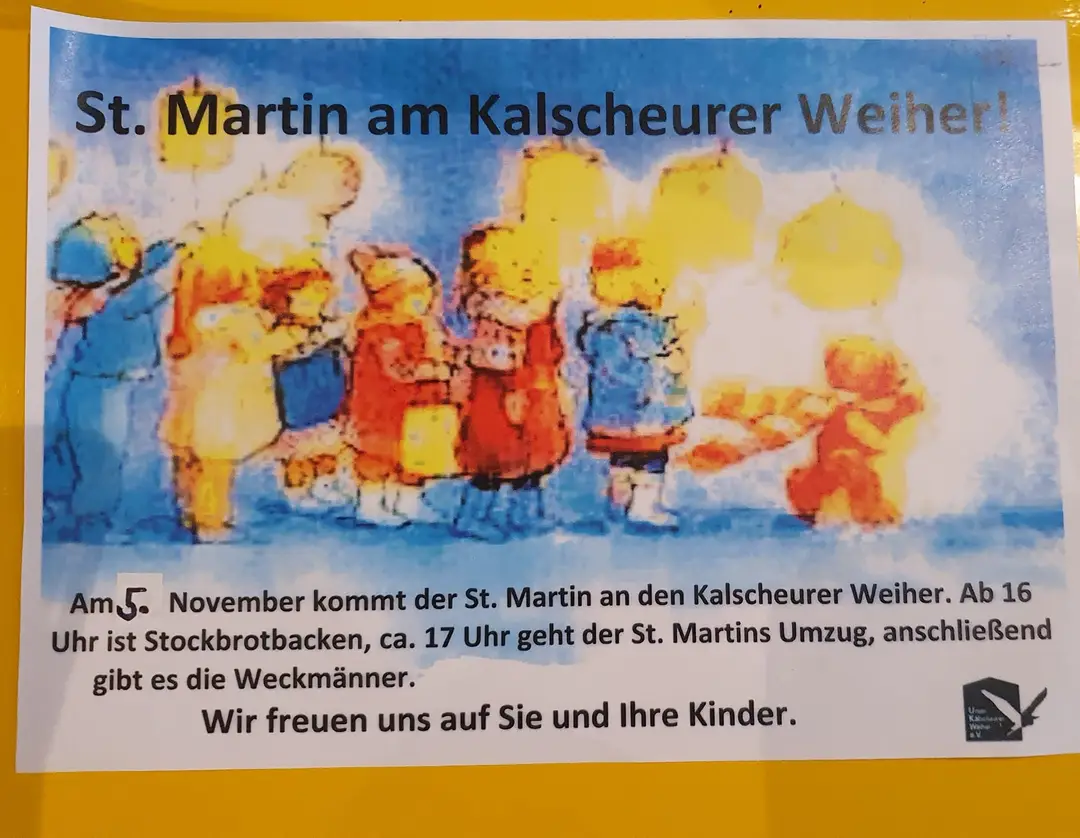 Ab 16.00 Uhr Stockbrotbacken und gegen 17.00 Uhr geht der St. Martinszug, anschl. Weckmännerverteilung |