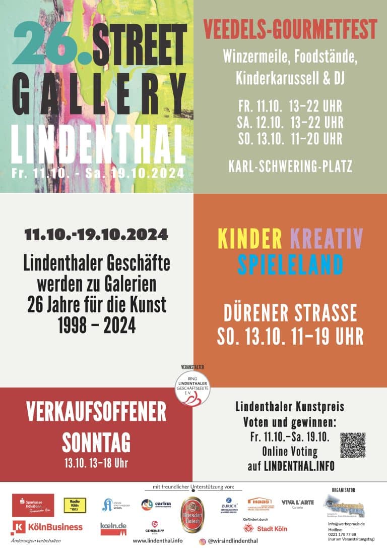 Die Preisverleihung des 1. LINDENTHALER KUNSTPREIS wird am 25.10.2024 um 15 Uhr verliehen: in der Galerie Viva l`Arte in der Zülpicher Str. 351 – 50937 Köln
