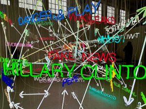 Pizzagate ist eine große, dreidimensionale Neon-Skulptur in der Form einer iCloud, die diagrammatisch als Netzwerk aufgebaut