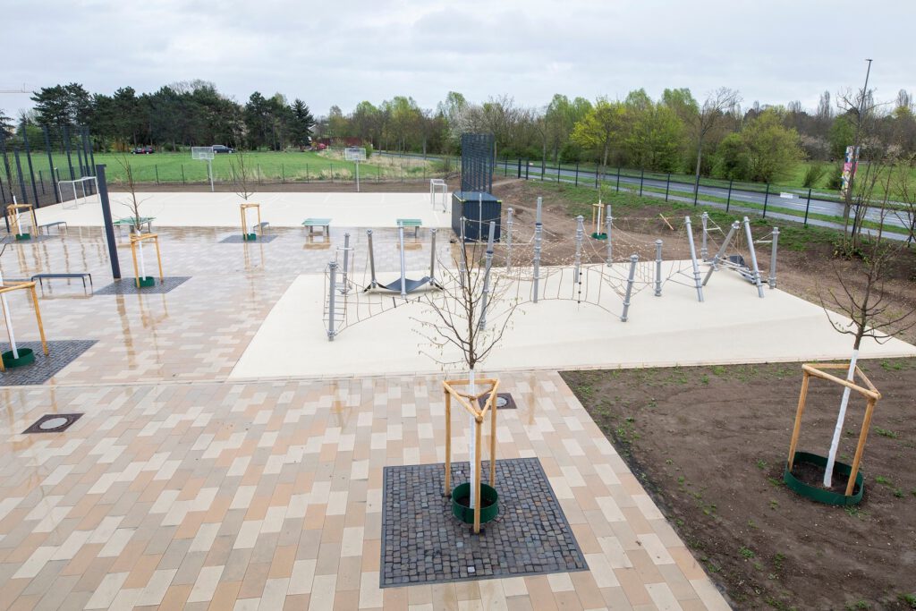 Vis à vis zum Neubau der Ernst-Moritz-Arndt-Grundschule entsteht der Neubau der privaten Offenen Schule Köln. Die Haupteingänge beider Schulen öffnen sich über Vorplatzbereiche zu einem gemeinsamen, nur Fußgängern und Radfahrern vorbehaltenen Hauptweg, der die Anbindung an die angrenzenden neuen Wohngebiete sicherstellen soll. So entsteht eine großzügige und offene Willkommensatmosphäre. Der gemeinsam genutzte Parkplatz wurde mit Strom und Anschlüssen ausgerüstet, um später Ladesäulen für E-Autos aufstellen zu können.