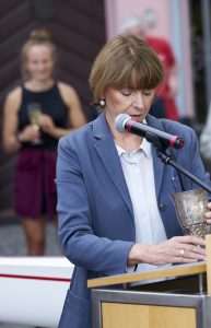 „Ich taufe dich auf den Namen „Stadt Köln“. Und möge immer eine Handbreit Wasser unter deinem Kiel sein!“ Oberbürgermeisterin Henriette Reker beschließt diesen rituellen Taufspruch mit einem Schwall Rheinwasser, den sie aus einem Siegerpokal auf den neuen Rennachter des Kölner Rudervereins von 1877 e.V. (KRV) ausgießt. Gleichzeitig wird der Schriftzug aufgedeckt und das Boot steht in aller Pracht zur Besichtigung frei.