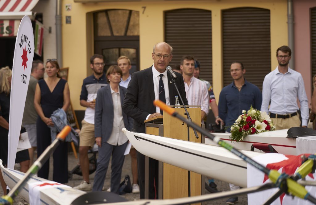 Vorher hatte Max Zünkler, Vorsitzender des KRV, darauf hingewiesen, dass der KRV-Vereinsachter 1952 bei der Olympiade in Helsinki im Endlauf den 5. Platz errungen habe. Und dass die Taufe eines Achters für jeden Ruderverein etwas ganz Besonderes ist. Und wenn diese von einer Frau vorgenommen werde, dann wären diese Boote mit besonderem Glück ausgestattet. Den letzten Rennachter hatte der KRV vor 30 Jahren angeschafft – lange her. Diesmal lagen zwischen Beschluss, Finanzierung und Bestellung nur wenige Monate. Die Finanzierung stemmte der KRV allein. Nicht zuletzt haben zahlreiche dem Leistungssport besonders verbundene Spenderinnen und Spender einen entscheidenden Beitrag geleistet.