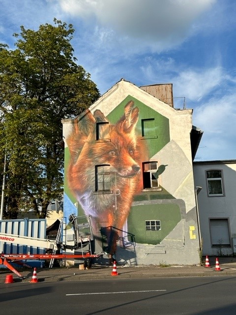 Noch bis vor sechs Jahren stellte die Flint hier Farben her, da passt das richtig gut mit dem Fuchs. Drei Tage arbeitete de Laporte an dem Werk. Wir können uns geehrt fühlen. Seine Fassandkunst prangt weltweit an Wänden. Als nächstes ist Jack Lack in der Südstadt gebucht, gemeinsam mit Graffitikünstler Kai „Semor“ Niederhausen. Der Sommer, so erzählt er, sei immer voll gepackt mit Aufträgen. Köln hat sich der Stuttgarter bewußt ausgesucht. Berlin sei „durch“. Köln sei nicht so übersättigt. An sich selbst hat er als Fassadenkünstler einen „krassen Anspruch“. Er mag das Realistische, aber auch leicht Morbides. Den Vergleich mit den Sprayern in der Stadt scheut er nicht. Sein Urteil: Diese Kunst steht der Stadt. Die Szene hier ist offen, hier gibt es kein Gegeneinander, man gehört sofort dazu. Das meiste seines Talents ist autodidaktisch. In der Zeit als das Gelände leer stand, streunte hier tatsächlich ein Fuchs durch die Gegend. Und noch etwas: Keine 100 Meter weit entfernt, geht es in den Fuchskaulenweg. Geht mal vorbei. Es lohnt sich!