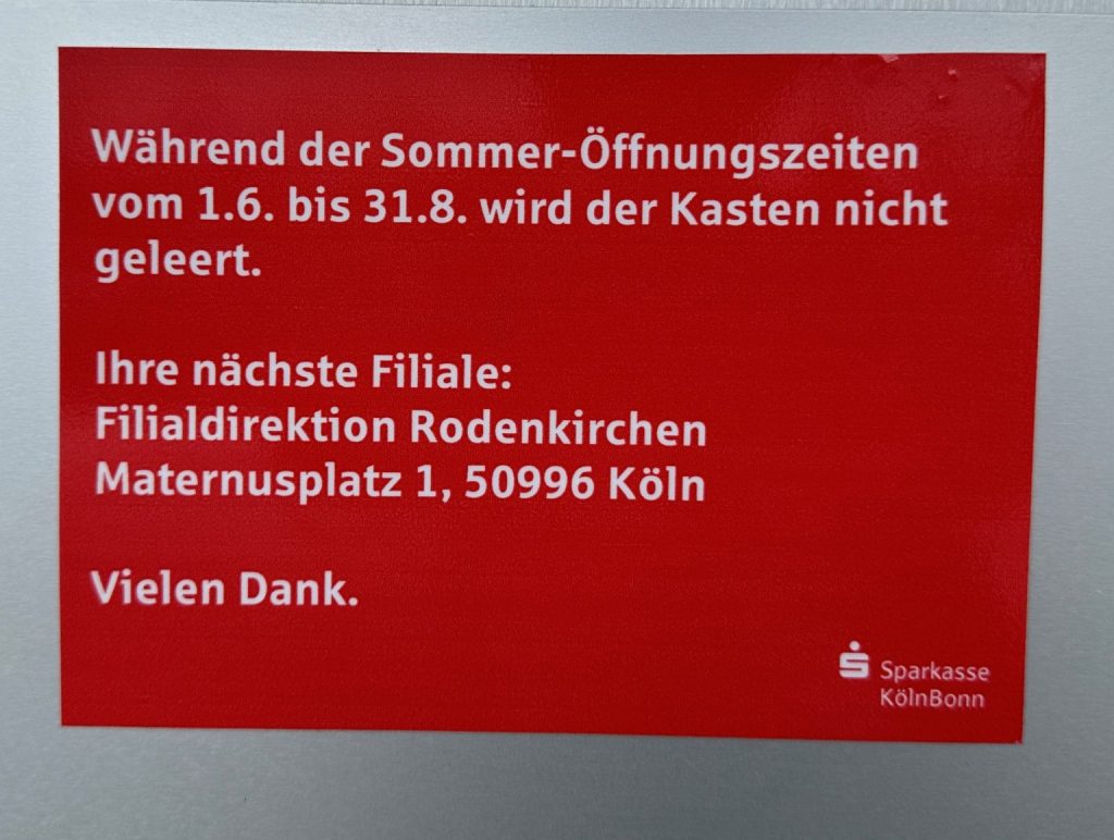 Hier wurde kurzerhand der Briefkasten der Sparkasse KölnBonn zugeklebt. Veedellieben hat bei der Pressestelle einmal nachgefragt und diese Antwort bekommen: „Der Briefkasten bleibt während der Sommeröffnungszeiten geschlossen, weil wir keine tägliche Leerung außerhalb der Öffnungszeiten sicher stellen können. Dies ist aber nötig, weil dort auch Überweisungen oder Unterlagen eingeworfen werden können, die taggleich bearbeitet werden müssen.