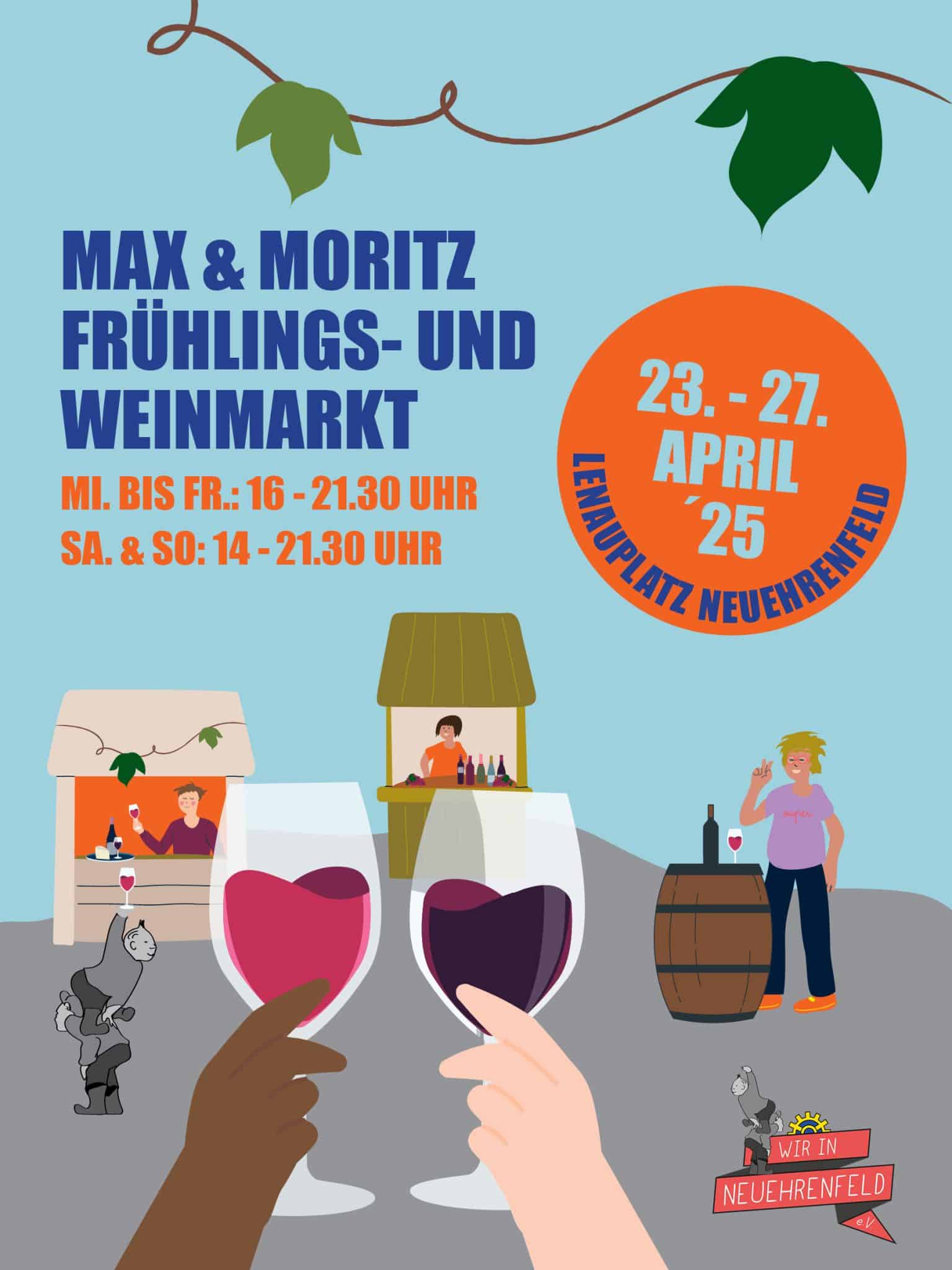 Außerdem erwartet euch vom 23. bis zum 27. April 2025 am Lenauplatz in Neuerehrenfeld ein ganz besonderes Event: Der Frühlings- und Weinmarkt! Inmitten des lebendigen Stadtteils könnt ihr in einem charmanten Ambiente rund um den Brunnen eine wunderbare Zeit verbringen.