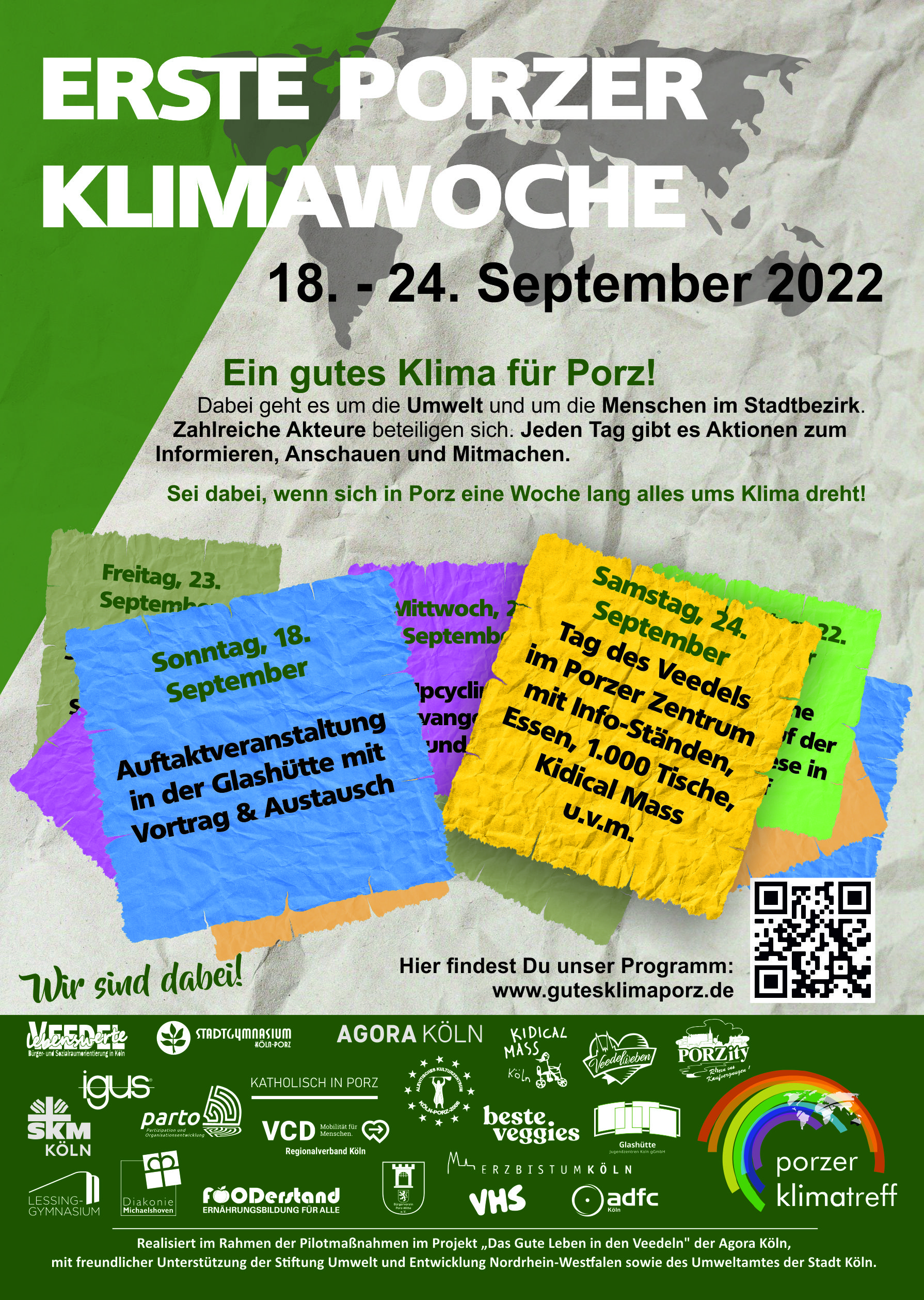 Erste Porzer Klimawoche vom 18.- September bis 24. September 2022. Es geht um die Umwelt und um die Menschen im Porzer Stadtbezirk. Jeden Tag gibt es Aktionen zum Informieren, Anschauen und Mitmachen. Am Samstag den 24. September, am Tag des Veedels, finden sich im Porzer Zentrum zahlreiche Info-Stände, Essen, Abschlussveranstaltung der 1000 Tische, die Kidical Mess, eine Suchaktion bei der bei einem Bummel durch die Innenstadt Gutscheine für Ihren nächsten Einkauf gefunden werden können, u.v.m..