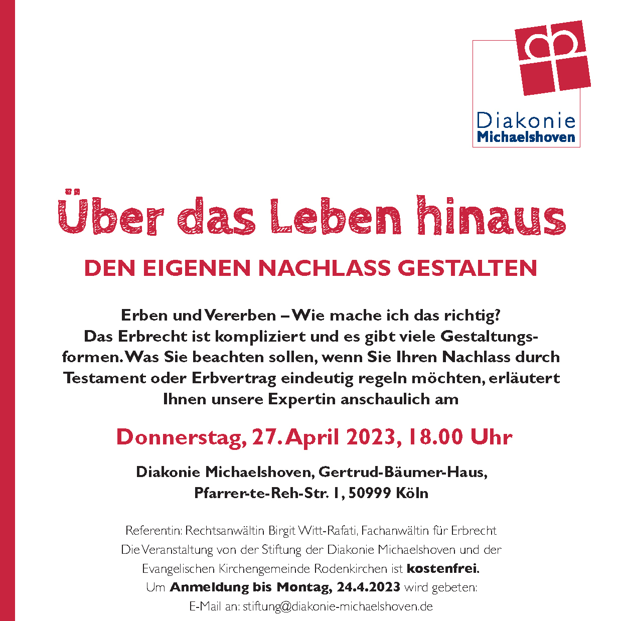 Diakonie Michaelhoven e.V. Pfarrer-te-Reh-Straße 1, Köln, DeutschlandMit einem kleinen Weihnachtsmarkt ab 17 Uhr im Kreuzgang der Erzengel-Michael-Kirche beginnt ein festliches Programm in der Diakonie Michaelshoven, Pfarrer-te-Reh-Straße 7. Der Kammerchor der Kreuzkirche Bonn „Vox Bona“ ist zu Gast und hat aus seinem umfangreichen Repertoire weihnachtliche Chorwerke ausgesucht, die ab 19 Uhr von etwa 50 Sängerinnen und Sängern vorgetragen werden. Der Eintritt ist […]