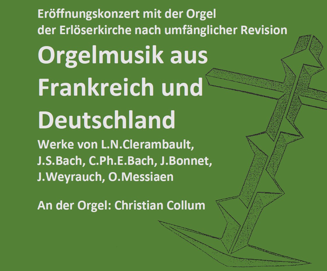 Orgel der Erlöserkirche erklingt nach umfassender Revision erstmals im Konzert mit Orgelmusik aus Frankreich und Deutschland Im Konzert erklingt erstmals die Orgel der Erlöserkirche, Sürther Str.34  in der von Orgelbau Merten technisch und klanglich überholten Form. Christian Collum wird, eingebettet in einen Rahmen adventlicher Choralvorspiele, ein großes Spektrum an Klangfarben zum Klingen bringen mit konzertanter […]