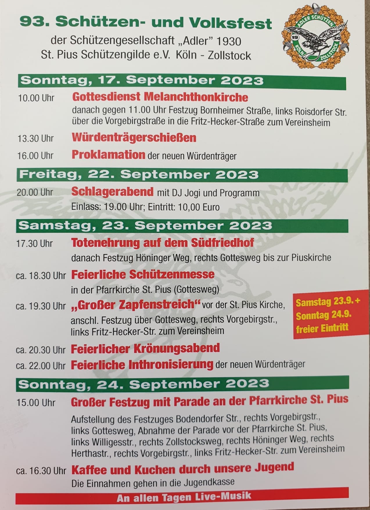 Samstag 23.09. 17.30 Uhr Totenehrung auf dem Südfriedhof danach Festzug zur Piuskirche ca. 18.30 Uhr Schützenmesse in der Pfarrkirche St. Pius 19.30 Uhr Großer Zapfenstreich vor St. Pius anschl. Festzug zum Vereinsheim 20.30 Uhr Ferlicher Krönungsabend im Vereinsheim ca. 22.00 Uhr Inthonisierung der neuen Würdenträger