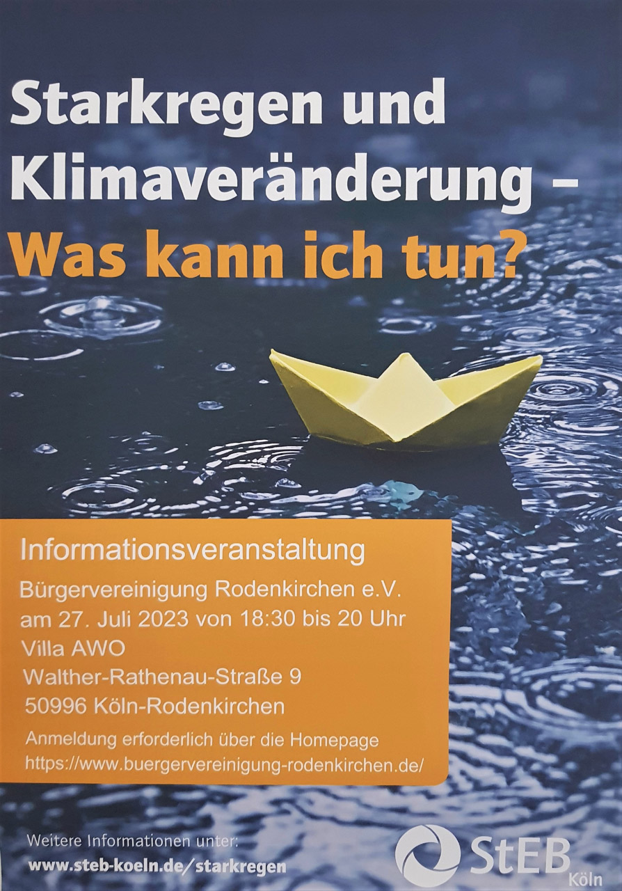 Arbeiterwohlfart Rodenkirchen Walter-Rathenau-Straße 9, Köln, DeutschlandWie schütze ich mich vor Starkregen? Die Bürgervereinigung Rodenkirchen lädt zu einem Informationsabend der Stadtentwässerungsbetriebe Köln (StEB) ein. Die kostenlose Veranstaltung findet statt am Donnerstag, 27. Juli 2023 von 18 bis 20 Uhr in der Villa AWO (Arbeiterwohlfahrt Rodenkirchen), Walter-Rathenau-Str. 9, 50996 Köln. Eine vorherige Anmeldung ist erforderlich auf www.buergervereinigung-rodenkirchen.de Klimawandel und nicht zuletzt […]