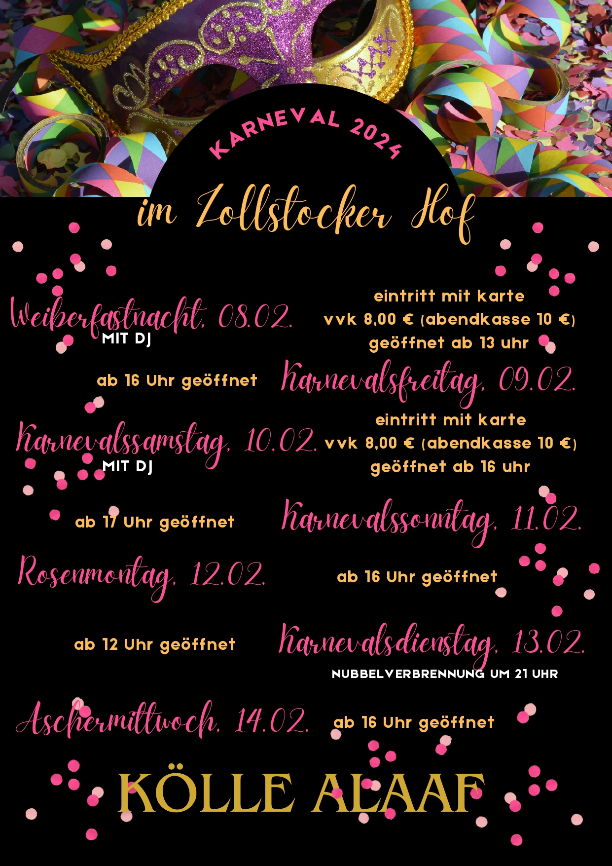 Von Weiberfastnacht bis Aschermittwoch ist wieder Party im Zollstocker Hof angesagt. Schaut auf dem Plakat, was, wann stattfindet. Stimmung ist hier garantiert!!!