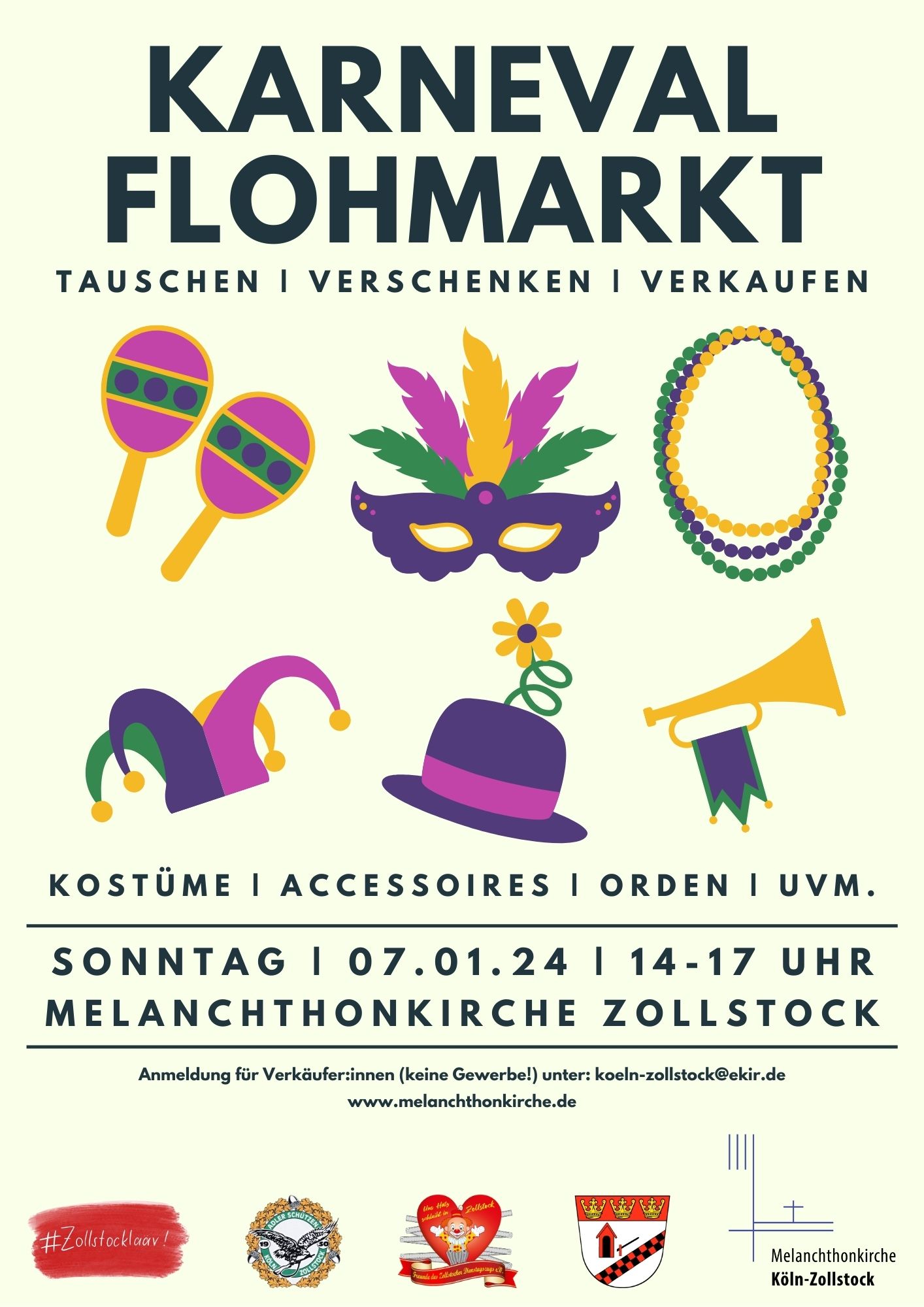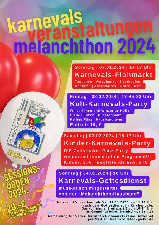 Karnevals Flohmarkt mit Second-Hand-Kostümen, Hüten, Accessoires, Orden, Pins im Kirchsaal. Sie können sich als Verein oder als Einzelperson mit einem eigenen Stand beteiligen. Als Gegenleistung bitten wir um Lebenssmittel für unsere wöchentliche Diakoniesprechstunde für bedürftige ZollstockerInnen Anmeldungen bitte Evangelische Kirchengemeinde Melanchthon koeln-zollstock@ekir.de