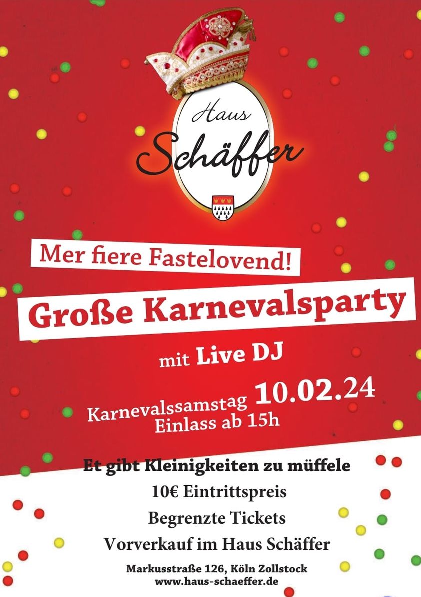 10. Februar 2024 @ 15:00 - 23:30 Karnevalsparty im Haus Schäffer Restaurant Haus Schäffer Höninger Platz/Südfriedhof