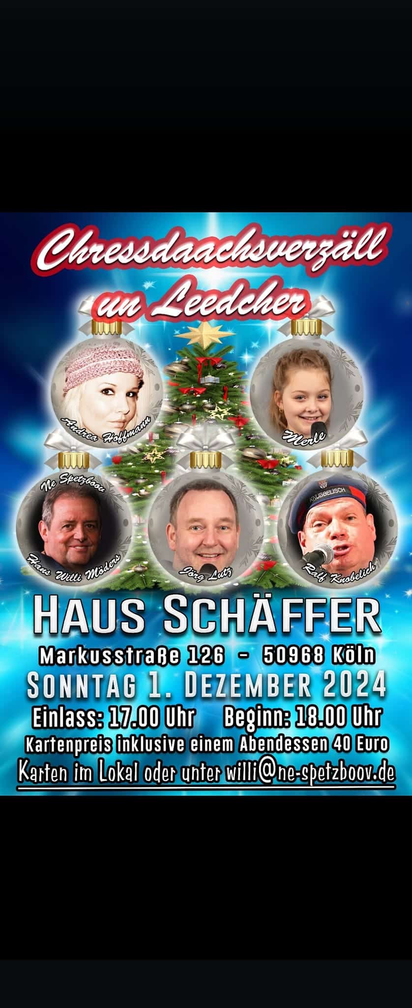 1. Dezember 2024 @ 18:00 - 23:30 Chressdaachsverzäll un Leedcher im Haus Schäffer incl. Abendessen Restaurant Haus Schäffer Höninger Platz/Südfriedhof