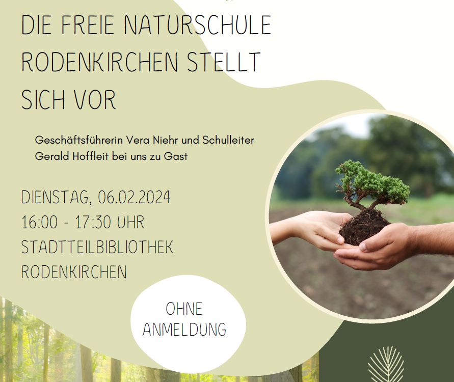 Stadtteilbibliothek Rodenkirchen Schillingsrotter Straße 38, Köln, DeutschlandDie Freie Naturschule Rodenkirchen mit einem Vortrag in der Stadtteilbibliothek Rodenkirchen vor. Geschäftsführerin Vera Niehr und Schulleiter Gerald Hoffleit sind bei uns zu Gast und laden zu einem Vortrag ein. Eine Anmeldung ist nicht erforderlich. Es handelt sich um eine Veranstaltung im Rahmen von Floating Green.